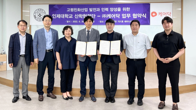 인제대 산학협력단과 시니어 돌봄 플랫폼 케어닥(대표 박재병)이 인제대 인당관 7층 세미나실에서 고령친화 산업발전과 전문인력 양성을 위한 업무 협약을 체결했다.