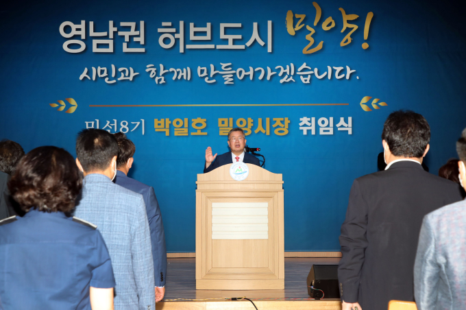 경남도 기초단체 중 유일하게 3선에 성공한 박일호 밀양시장이 1일 오전 10시 시청 대강당에서 민선 8기 밀양시정 취임식을 열어 "밀양권 허브도시를 만들겠다"고 밝혔다.