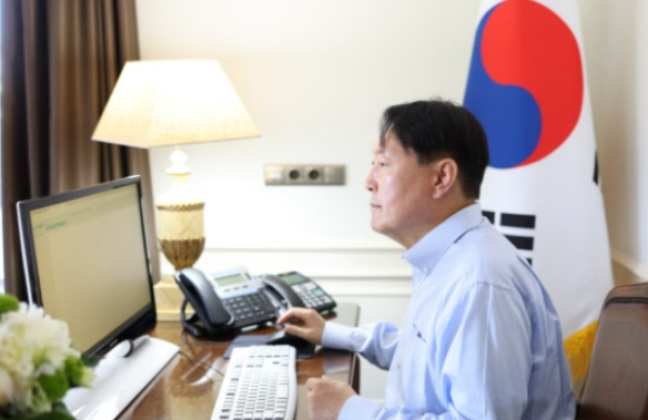 논란이 확산하자 대통령실은 입장문을 통해 “오늘 배포한 순방 사진 가운데 윤 대통령이 컴퓨터 모니터 앞에 있는 사진 속 모니터 화면은 현지에서 대통령이 국무회의 안건을 결재한 직후 화면이 사라진 상태인 것”이라며 “오해가 없기를 바란다”고 밝혔다.
