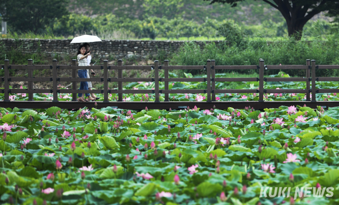 연일 찜통더위가 이어진 가운데 지난 6일 전남 강진군 병영면 하고제 연방죽이 흐드러진 홍련 잔치로 탐방객들을 유혹하고 있다.[사진=강진군]