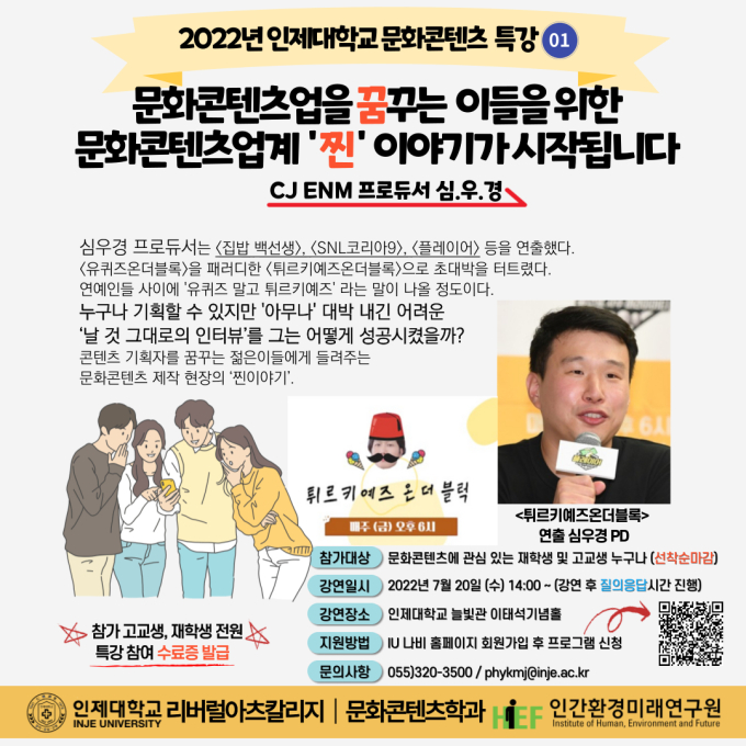 인제대학교가 오는 20일 오후 2시 김해캠퍼스 이태석기념홀에서 유튜브 인기콘텐츠인 '튀르키예즈 온 더 블록'의 연출자인 심우경 PD를 초청해 문화콘텐츠 특강을 진행한다.