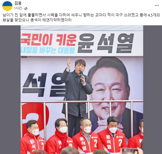 8일 김 의원은 자신의 페이스북에 “남이가 진 앞에 출몰하면서 사력을 다하여 싸우니 향하는 곳마다 적이 마구 쓰러졌고 몸에 4, 5개의 화살을 맞았으나 용색이 태연자약하였더라”는 글을 올렸다. 이와 함께 대선 당시 윤석열 대통령 후보에 대한 지지 연설에 나섰던 이 대표의 사진을 공유했다.
