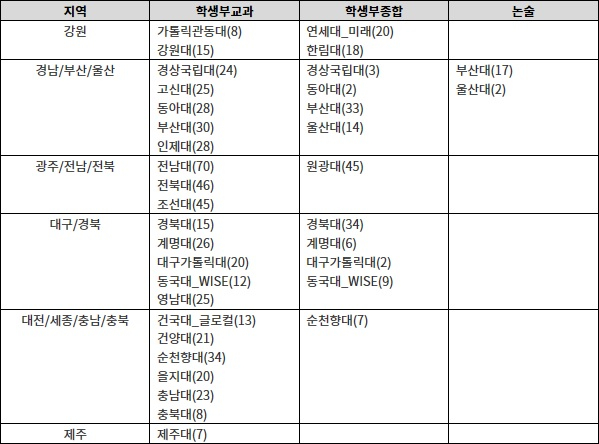 수시 지역인재 종합전형 의대 선발은 12개 대학에서 193명을 모집한다. 원광대가 45명(전북지역: 33명, 광주/전남지역: 10명, 광주/전남/전북지역: 2명)으로 가장 많은 인원을 선발하며, 경북대 34명, 부산대 33명 순으로 선발인원이 많다. 단, 충청권역 지역인재 종합전형은 순천향대에서만 7명을 선발한다. 해당지역 교과전형 선발인원이 119명임을 고려하면 해당 학생들은 교과전형을 우선으로 고려하는 것이 낫다.
