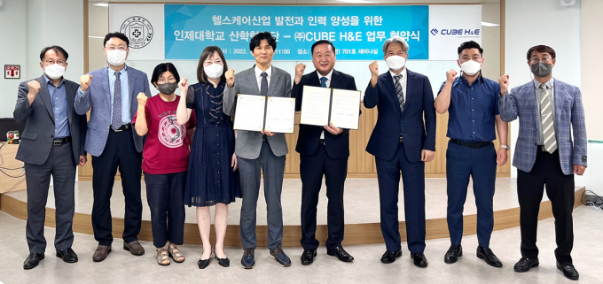 인제대 산학협력단과 ㈜CUBE H&E(대표 이시형)가 지난 13일 인제대 인당관 7층 세미나실에서 헬스케어산업 발전과 인력양성을 위한 상호 협력 업무협약을 맺었다.