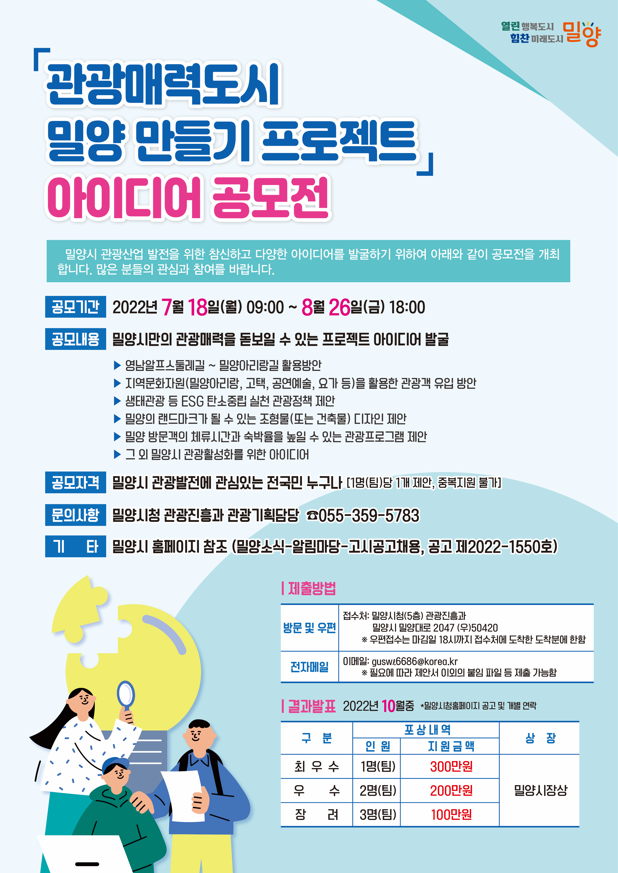 밀양시가 관광산업 발전을 위한 참신하고 다양한 아이디어를 발굴하고자 '관광매력도시 밀양 만들기 프로젝트' 아이디어 공모전을 개최한다.
