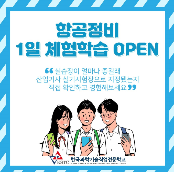 한국과학기술직업전문학교는 오는 7월 22일 오후 1시부터 3시까지 ‘항공정비 1일 체험학교’를 오픈해 운영한다고 21일 밝혔다.
