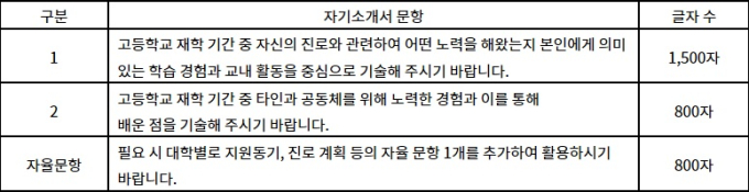 자료: 대학교육협의회 대입정보포털 어디가 2022학년도부터 한국대학교육협의회는 대학마다 제출서류의 양식이 달라 발생하는 혼란을 막고 수험생들의 부담을 줄이기 위해서 대학들의 의견을 수렴하여 변경된 자기소개서 공통 양식을 발표했고 2023학년도에도 이 바뀐 양식 그대로 활용될 예정이다.