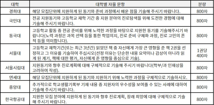 아래 표에 따르면 대학별 자율 문항은 대체로 지원 동기와 이를 위한 노력 과정을 묻고 있으며 대학에 따라 향후 진로계획까지도 추가된다. 경희대, 국민대, 동국대, 연세대 등은 표현만 약간씩 다를 뿐 묻는 내용은 ‘지원하게 된 동기와 지원하기 위해 노력한 과정’으로 동일하며 서울시립대와 한국항공대의 경우에는 지원동기에 더불어 진로계획까지 기술해야 한다.