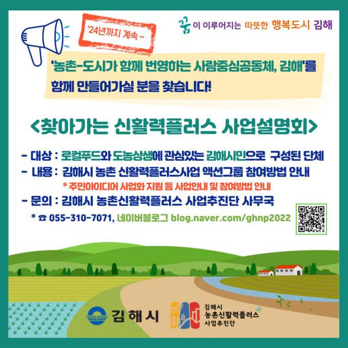 김해시가 '농촌-도시가 함께 번영하는 사람중심공동체, 김해'를 만들고자 농촌 신활력플러스사업을 2024년까지 추진한다.