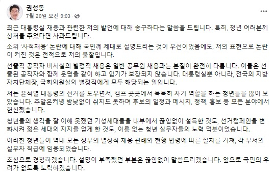 권 대행은 최근 9급 공무원 비하 발언으로 국민적인 공분을 사면서 또 실수를 저질렀다. 지인의 아들을 대통령실 행정요원으로 사적채용했다는 의혹이 제기되자 이를 해명하는 과정에서 말실수했다.