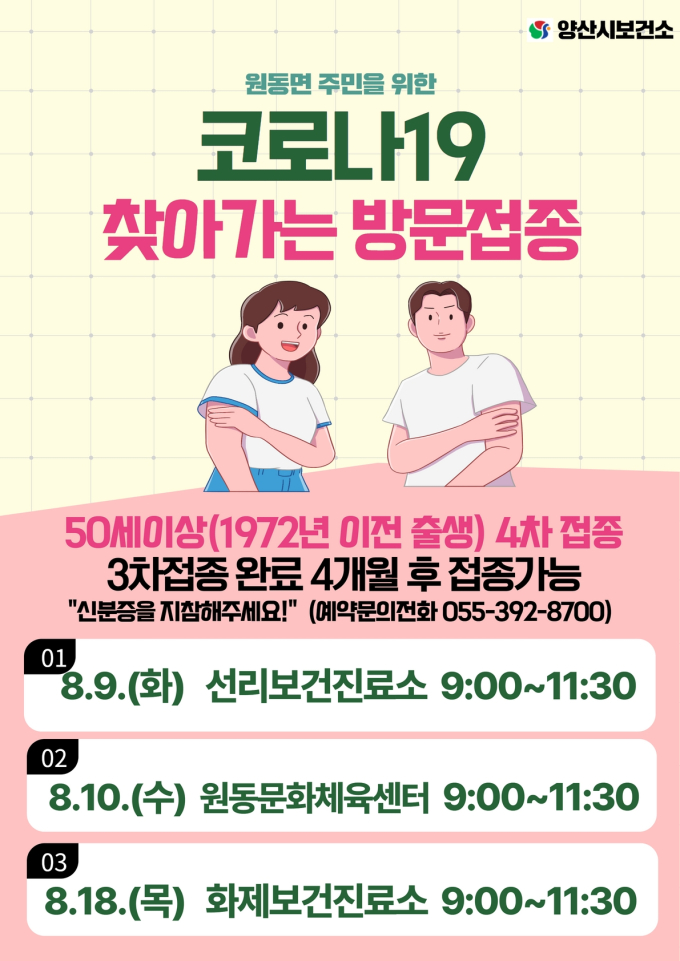 방문접종 날짜는 8월9일에는 선리보건진료소에서, 8월10일에는 원동문화체육센터에서, 8월18일에는 화제보건진료소에서 각각 진행한다. 50세 이상 대상자는 신분증을 지참하면 접종현장에서 누구나 백신접종을 받을 수 있다.