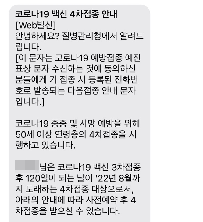 ‘질병관리청에서 알려드립니다. 박유진님은 4차 접종 대상으로서, 사전예약 후 4차 접종을 받으실 수 있습니다.’