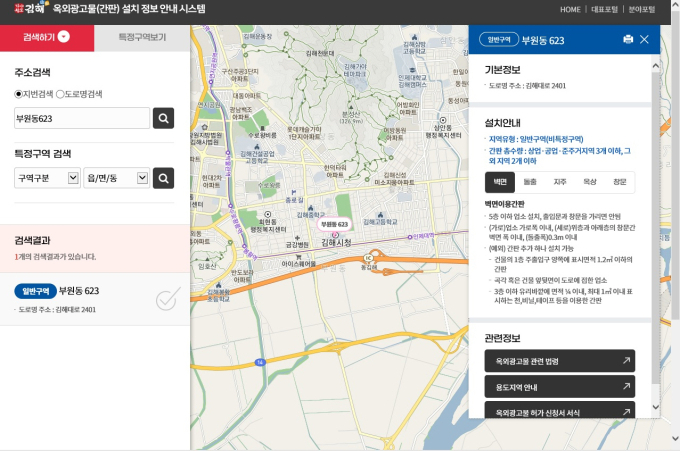 이 서비스를 이용하려면 '김해시청 누리집 > 자주찾는 서비스 > 광고물 연장신청·설치정보 배너'로 이동해 주소를 검색하면 옥외광고물 설치기준과 특정구역 지정 현황 정보를 확인할 수 있다.