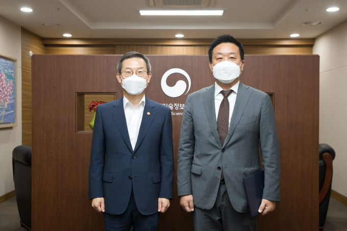 이종호 과학기술정보통신부 장관(왼쪽)이 24일 오전 세종특별자치시 세종파이낸스센터 과기정통부 집무실에서 황종성 한국지능정보사회진흥원장과 기념촬영 하고 있다.