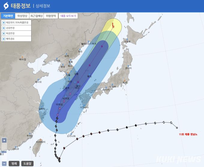 오전 6시경 부산으로 상륙해 9시에는 부산 북북동쪽 약 80㎞부근 육상까지 올라갈 것으로 예보하고 있으며, 중심기압 955hPa, 최대풍속 40㎧, 강풍반경 380㎞로 ‘강’한 상태를 유지할 것으로 전망하고 있다.