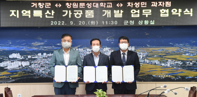 거창군은 20일 군청 상황실에서 구인모 군수, 창원문성대학교 박성호 산학협력단장, 차성민과자점 차성민 대표 등 관계자 8명이 참석한 가운데 지역농산물을 활용한 가공품 개발을 위한 업무협약을 체결했다.