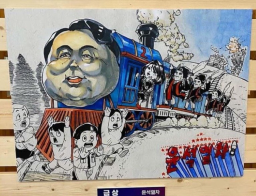 작품을 보면 윤 대통령 얼굴을 한 열차가 연기를 내뿜으며 철길을 달리며 놀란 시민들의 쫓는다. 열차 조종석에는 김건희 여사로 추정되는 인물이, 나머지 열차에는 검사복을 입은 사람들이 칼을 들고 서 있다.