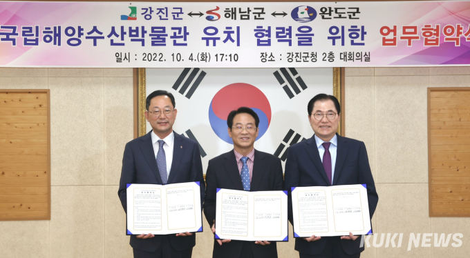 명현관 해남군수와 강진원 강진군수, 신우철 완도군수는 4일 강진군청서 국립해양수산박물관 유치‧건립을 위한 업무협약을 체결했다.