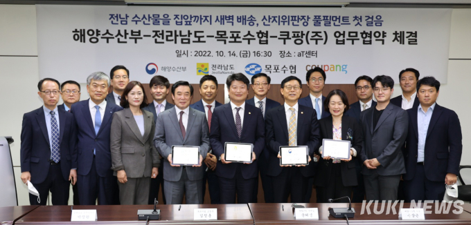 전남도는 14일 서울 aT센터에서 해양수산부, 쿠팡, 목포수협 간 업무협약을 체결하고 전남 수산물 산지직송 유통시스템을 구축하기로 했다.
