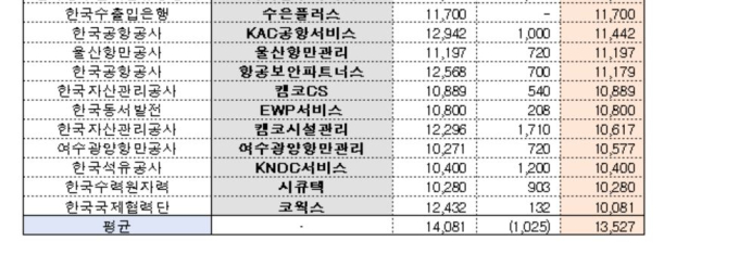 공공자회사 33개 기관의 임원 평균 연봉은 1억 3527만원이었으나, 직원 연봉은 3773만원에 불과했다. 임직원 간 연봉차이가 1억원 이상 차이나는 곳은 15곳이었는데, 한전 FMS가 1억 7548만원로 가장 격차가 컸고, 한전 CSC 1억 7,335만원, 한전 MCS 1억 6,350만원, 인천공항운영서비스 1억 2,505만원, 기보메이트 1억 2280만원으로 그 뒤를 이었다.