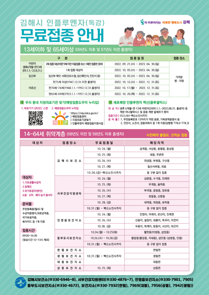 김해시가 24일부터 지자체 차원에서 인플루엔자(독감) 무료예방 접종을 한다. 무료예방접종 대상은 김해시에 주소지를 둔 만14-64세 취약계층으로 기초생활수급자나 국가유공자(본인), 장애인, 닭·오리·돼지농가 종사자들이다.
