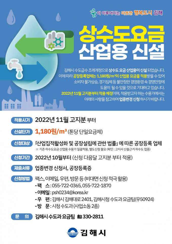 신설된 산업용 수도요금을 적용받고자 하는 기업체는 공장등록증을 구비해 시청 수도과를 방문하거나 이메일이나 우편, 팩스 등으로 업종 변경 신청을 하면 된다.