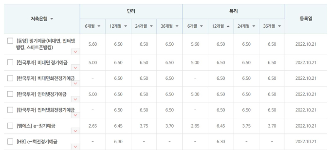 한국투자저축은행은 비대면 정기예금 및 비대면회전정기예금 등의 상품이 모두 6개월에 5.0%, 12개월~36개월에 6.50%의 동일한 금리를 보인다.