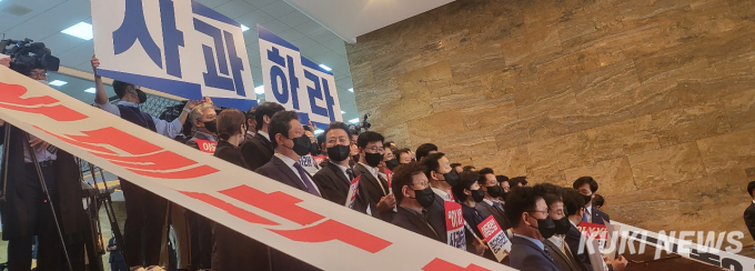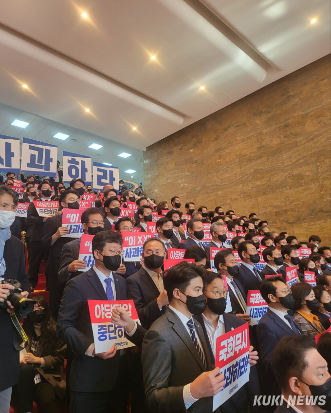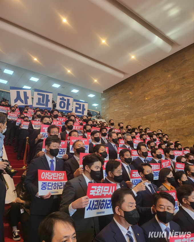 민주당이 ‘보이콧’ 불참을 결정한 의원총회 직후 국회 본관 중앙계단 앞에 모여 대형 현수막 2개와 사과하라는 팻말을 들고 강하게 반발하고 있다.