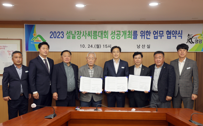 전남 영암군과 대한씨름협회는 지난 24일 영암군청 낭산실에서 ‘위더스제약 2023년 설날장사씨름대회’개최를 위한 업무 협약식을 가졌다.
