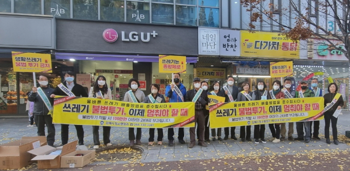 시는 불법투기에 대한 시민의식을 개선하고자 11월 한 달간 19개 읍면동별 중심지(상가)와 불법투기 상습지역을 중심으로 시민(사회단체)이 참여하는 민관 합동 캠페인을 전개하고 있다. 지난 8일 장유1동에서 벌인 캠페인에는 자율방재단 회원들과 공무원, 시의원 등 30여명이 자발적으로 참여했다.