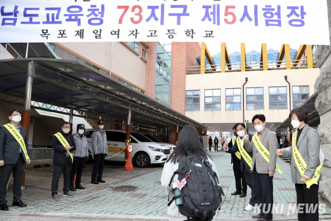 김대중 교육감을 비롯한 전남교육청 간부들은 이날 오전 73지구 제5시험장인 목포제일여자고등학교 교문에서 수험생들을 맞이하며 최선을 다해 줄 것을 당부했다. 현장에는 조옥현 전남도의회 교육위원장과 정선영 전남교육청 중등교육과장, 정대성 목포교육장 등도 나와 ‘파이팅’을 외치며 힘을 보탰다.