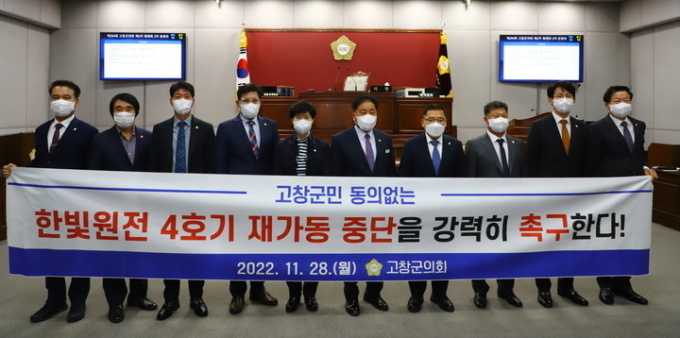 한빛원전에 인접한 고창군의회 역시 안전성이 확보되지 않은 한빛 4호기 재가공에 발끈하고 나섰다. 전수조사 없이 일부분만을 조사한 채 방사능 유출 위험이 없다고 판단한 보고서를 내고 재가동 절차에 들어간 것은 군민안전을 도외시한 처사라는 입장이다.