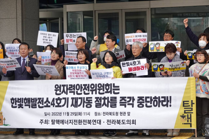 탈핵에너지전환전북연대와 전북도의회는 29일 전북도청 앞에서 기자회견을 열고 “원자력안전위원회는 30일 제167차 회의를 통해 ‘한빛 4호기 원자로 임계 전 정기검사 결과’를 보고안건으로 처리하고, 12월 1일 재가동을 위한 임계를 허용할 방침으로 알려졌다”며 “총체적 부실로 점철된 한빛4호기를 전수조사와 제대로 된 건전성평가도 이뤄지지 않은 상태에서 재가동해서는 안 된다”고 주장했다.