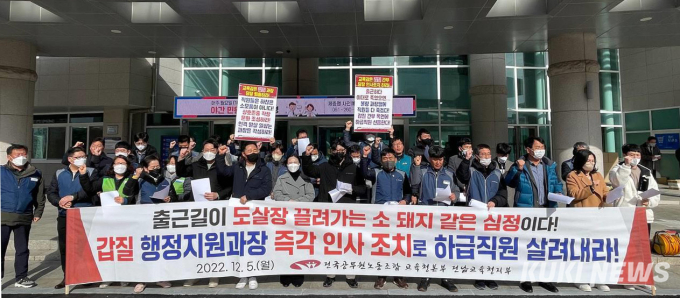 노조는 5일 오전 도교육청 현관 앞에서 갑질 행정지원과장을 규탄하는 기자회견을 열고 이같이 요구했다.