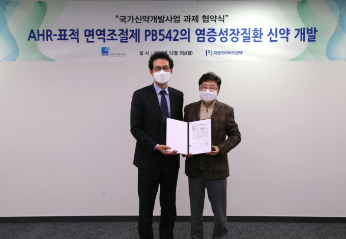 이 회사 관계자는 "파렌키마바이오텍의 AHR-기반 설계 평가시스템을 통해 개발한 PB542는 장 조직 면역밸런스 회복 능력이 우수하며 염증성 질환 동물 모델에서 뛰어난 치료 효과를 보였을 뿐 아니라 만성 대장 염증이 대장암으로 발전하는 것을 차단하는 효과도 확인했다. 이런 우수성과 차별성이 국가신약개발사업 선정 과정에서 높게 평가됐다" 말했다.