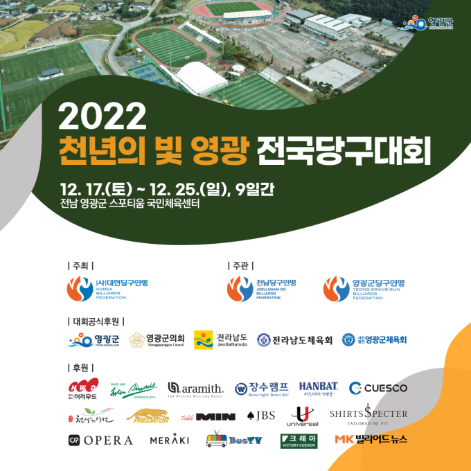 대한당구연맹이 주최하고 전남도당구연맹‧영광군당구연맹이 주관하며 영광군‧영광군의회가 후원하는 이번 대회는 전문선수 700명과 생활체육선수 1600명 등 총 2300명이 참가하며 캐롬 3쿠션 단일 종목으로 진행된다.