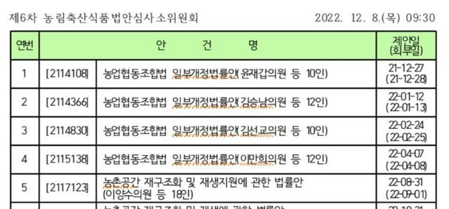 정치권에 따르면 8일 국회 농림축산식품해양수산위원회는 법안심사 소위원회를 열고 4건의 농업협동조합법 일부개정법률안에 대해 심사에 들어간다. 발의된 개정안 4건은 모두 농협중앙회 회장의 중임 제한을 완화해 한 차례 연임할 수 있도록 하는 내용을 담고 있다. 현재 농협법은 중앙회장의 임기를 4년으로 규정하고 연임할 수 없도록 제한하고 있다.