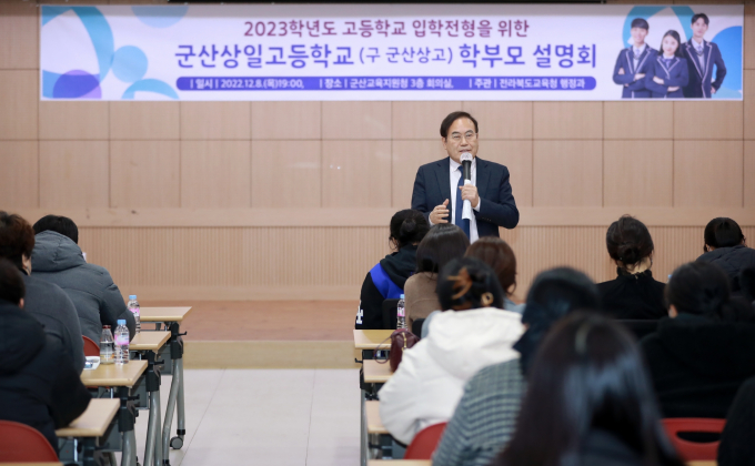 전북도교육청은 지난 8일 오후 7시 군산교육지원청 3층 회의실에서 ‘2023학년도 고등학교 입학전형을 위한 군산상일고 학부모 설명회’를 가졌다.