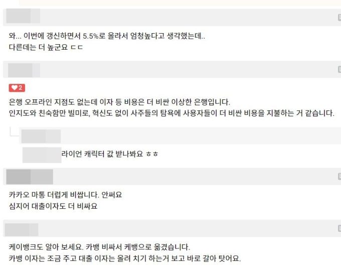 온라인 커뮤니티에서는 카카오뱅크의 마통 금리와 관련한 불만을 쉽게 찾아볼 수 있다. 한 게시자는 “마통을 연장하는 과정에서 금리가 4%대에서 8.8%로 상승했다”며 “보험금 대출로 갈아타겠다”고 토로한다. 이 게시글에는 “오프라인 지점도 없는데 이자 등 비용은 더 비싼 이상한 은행이다”, “케이뱅크 알아보세요, 카뱅 비싸서 케뱅으로 옮겼습니다” 등 카카오뱅크에 불만을 제기하는 댓글이 많다.
