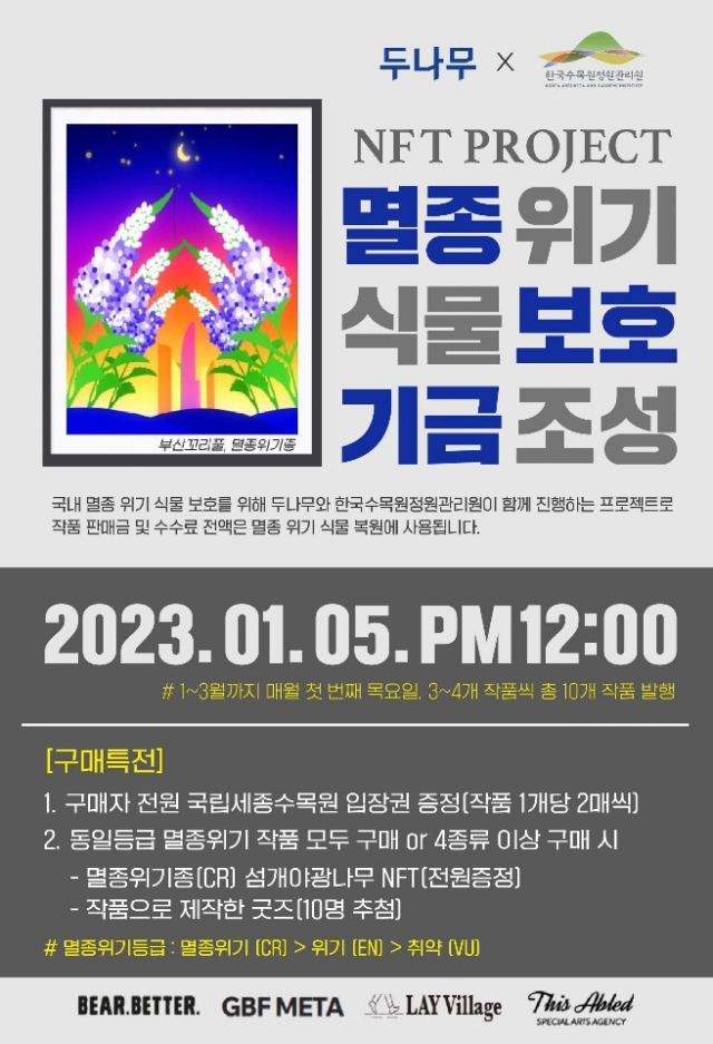 두나무는 이번 프로젝트를 통해 발행된 NFT 판매 수수료 전액을 멸종 위기 식물보호기금으로 조성할 계획이다. 생물의 다양성 보전과 건강한 자연 환경을 기원하는 취지다. 기부금은 한국수목원정원관리원을 통해 희귀·특산 식물의 자생지를 보존하고 확대하는 등 멸종 위기 식물 보호에 쓰일 방침이다.