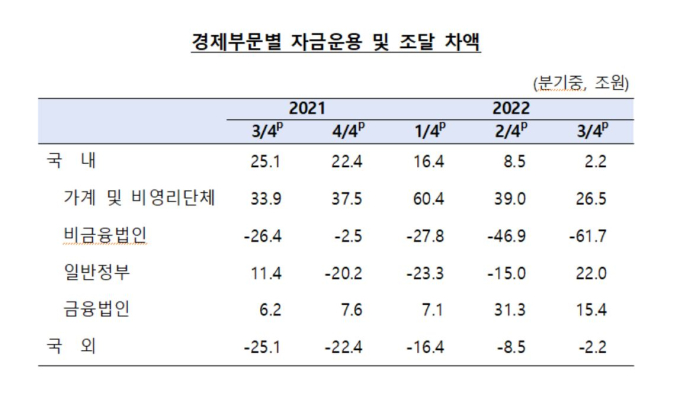 5일 한국은행이 발표한 ‘2022년 3분기 중 자금순환(잠정)’에 따르면 올해 3분기 가계 및 비영리단체의 순자금운용(자금운용-자금조달) 규모는 26조5000억원으로 전년 동기(33조9000억원)에 비해 7조4000억원 축소됐다. 이는 2021년 2분기(24조5000억원) 이후 1년 3개월 만에 가장 낮은 규모다.