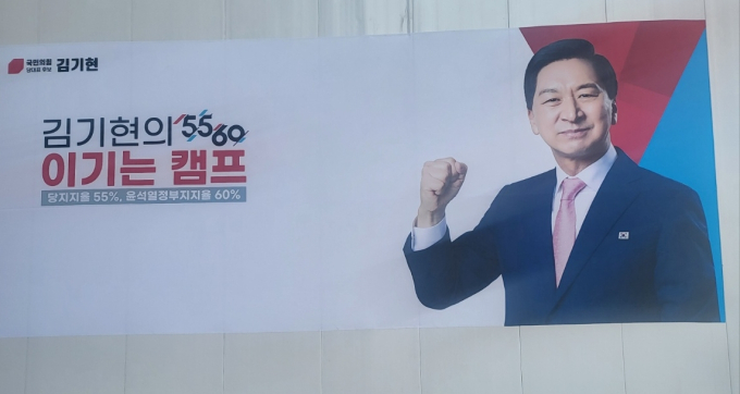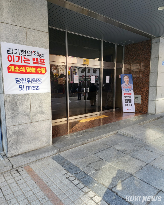 건물 우측에는 책상을 두고 입장하는 의원과 언론인을 위한 표찰 등을 나눠줬다. 행사장 우측에는 ‘김기현의 5560 이기는 캠프’ 포스터가 붙어있다.
