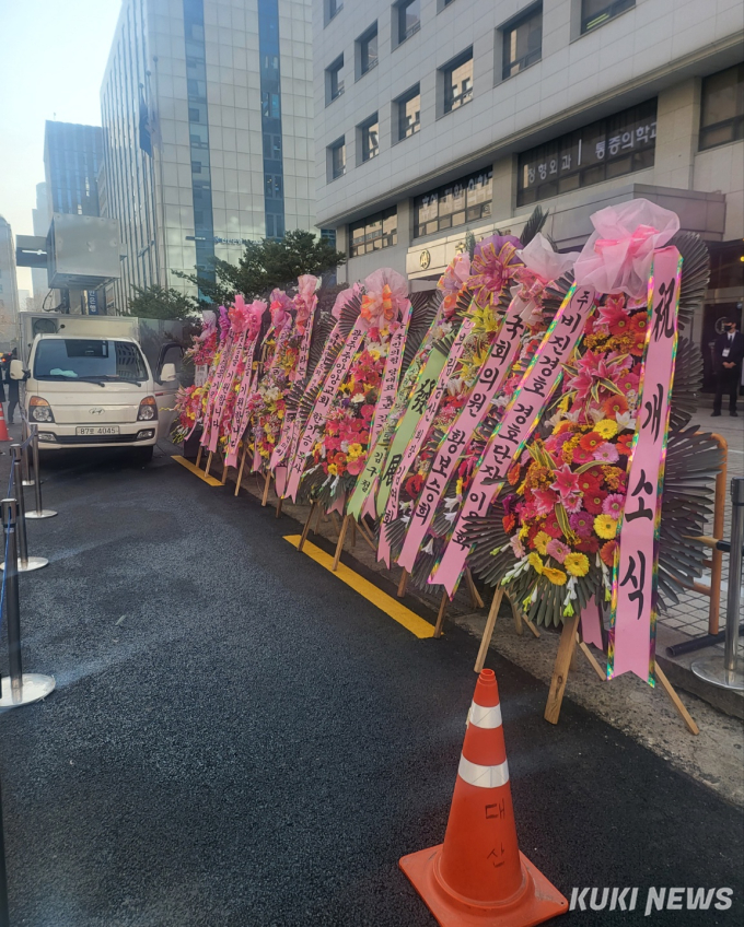 캠프 앞에는 황보승희 국민의힘 의원과 후원회장의 화환들이 줄지어 늘어서 있다. 개소식 전 개막 행사가 준비돼 1층에는 LED를 내장한 트럭이 주차돼 있다.