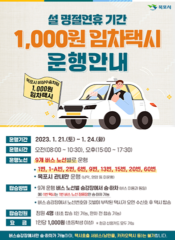 1000원 임차택시 여부는 택시 뒷면에 부착된 깃발로 확인 가능하고, 사업 구역상 목포 시내만 운행하며 호출(낭만콜, 카카오) 시스템 이용은 불가하다.