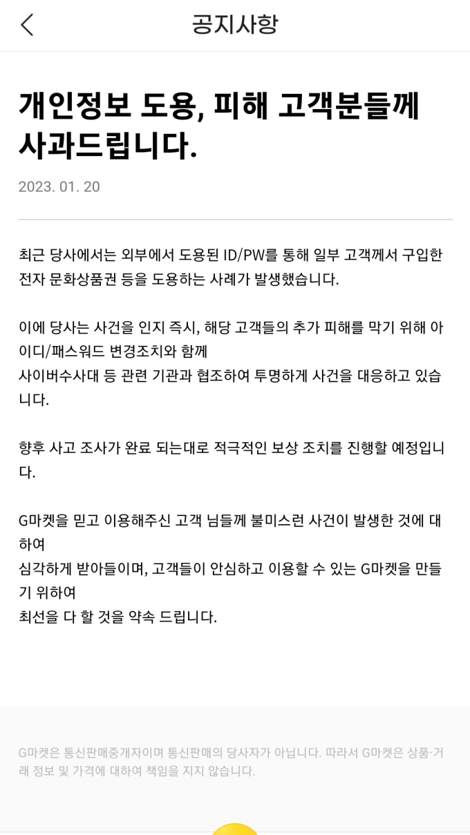 익명을 요구한 한 피해자도 “지마켓에서 30만원치 문화상품권 구매를 했고 지난 20일 저도 모르는 사이에 사용 완료라고 떠 있더라”며 “사이트 쿠폰함에 핀번호가 훤히 보이게 해 놓았다. 사이트마다 같은 아이디와 비번을 써도 그걸 보호해주는게 사이트의 역할 아닌가. 현금성 물건을 팔면서도 보안을 이렇게 허술하게 해놓고 소비자에게 책임만 전가하고 있다”고 털어놨다.