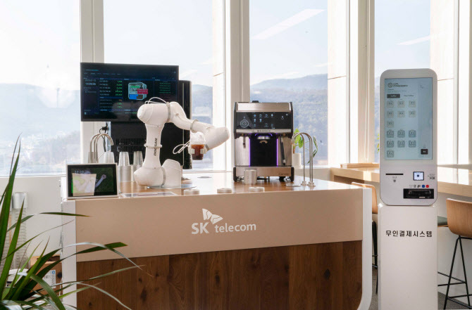 SK텔레콤이 27일 두산로보틱스와 함께 무인 커피로봇 ‘AI바리스타로봇’을 출시했다.