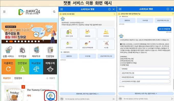 우선 사용자가 알고 싶은 내용을 문장이나 단어로 질문하면 소비자24 내 관련 메뉴를 알려주는 챗봇 서비스를 도입했다. 정부서비스나 민원정보에 대한 궁금사항을 알려주는 행정안전부 국민비서 챗봇 ‘구삐’와도 연계했다.