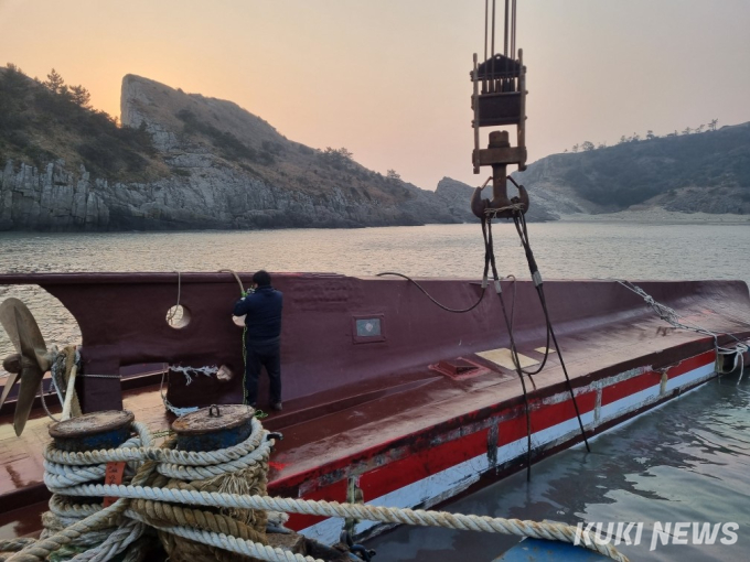 크레인선에 묶여 뒤집힌 채 안전지대로 옮겨진 청보호는 크레인선이 닻을 내려 자리를 잡은 뒤 인양을 위한 1차 고정 작업을 마쳤다.