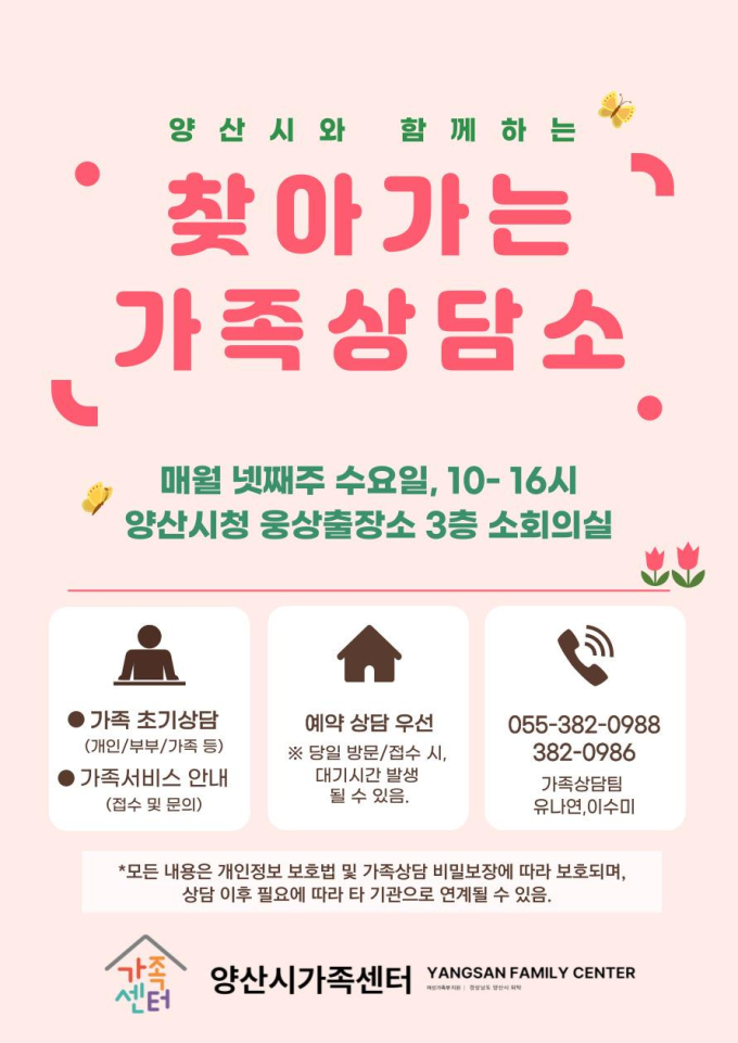 가족상담소는 2월부터 11월까지 매월 넷째주 수요일 10시부터 오후 4시까지 웅상출장소 3층 소회의실에서 운영한다.