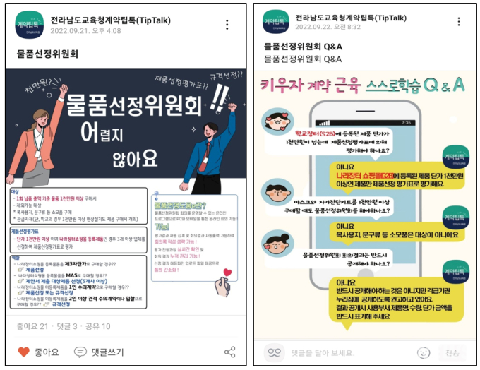 도교육청은 이 채널을 통해 새로 개정된 계약 규정이나 업무 추진 시 꼭 필요한 계약정보를 누구나 쉽게 이해할 수 있도록 카드뉴스 형태로 제작해 전송해 주고 있다.